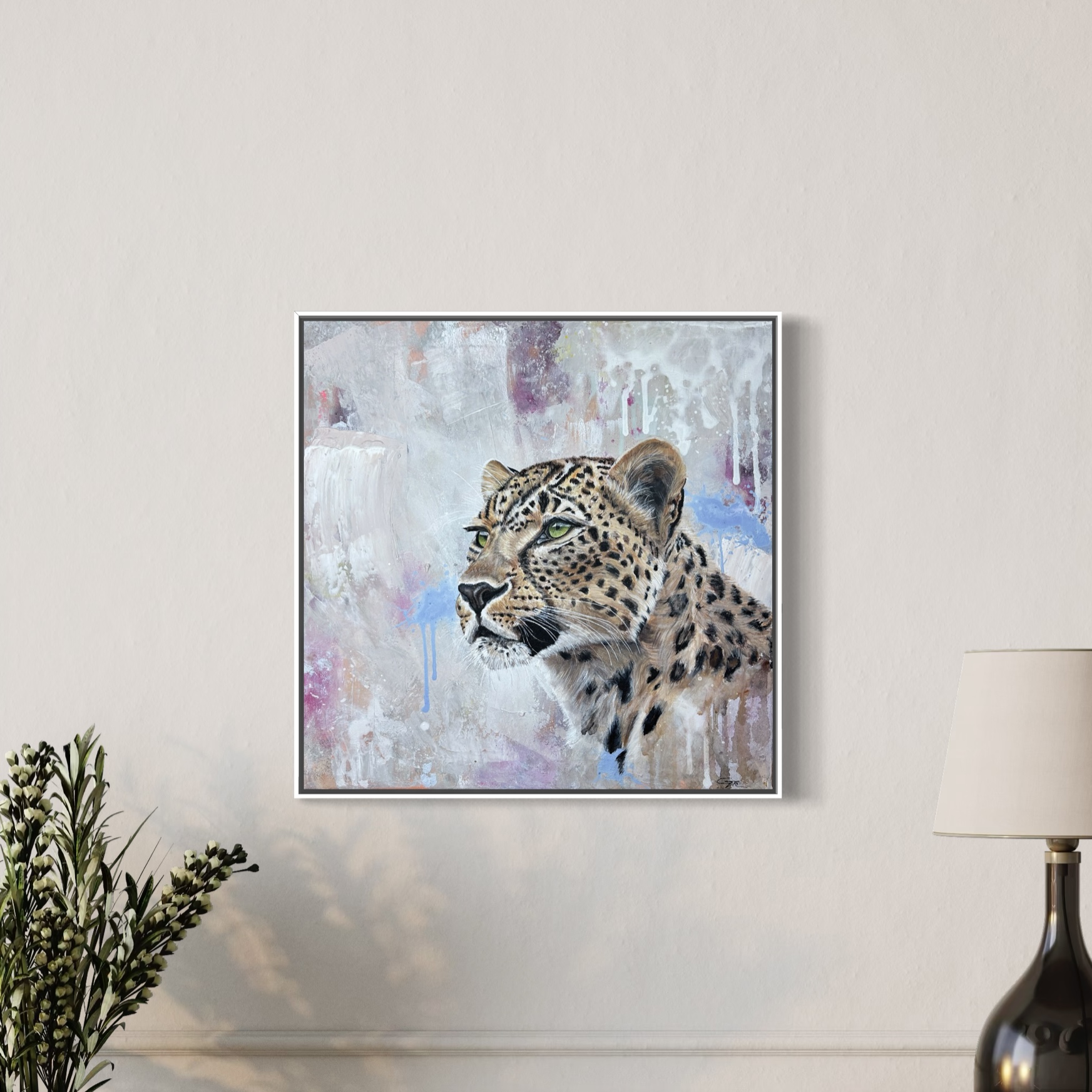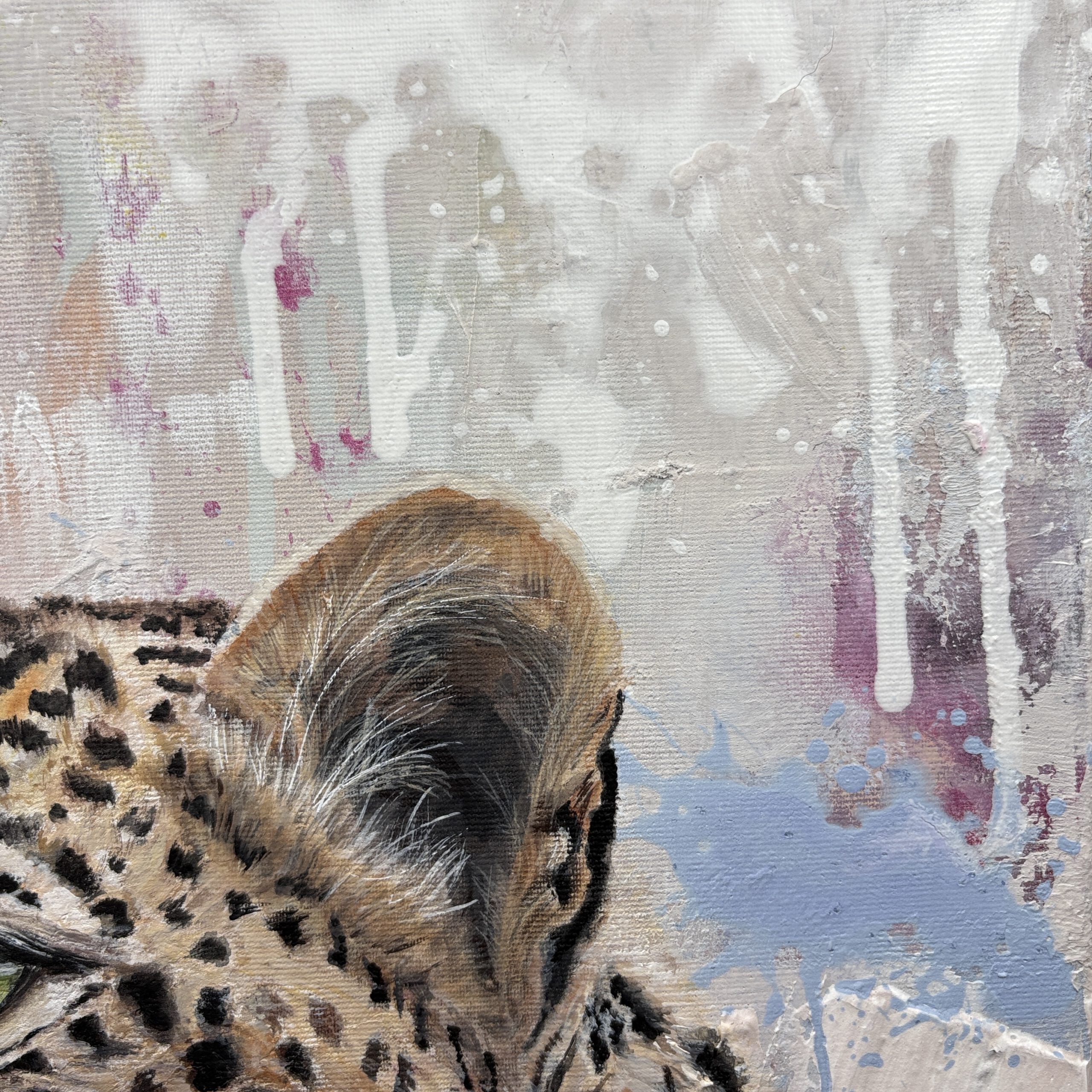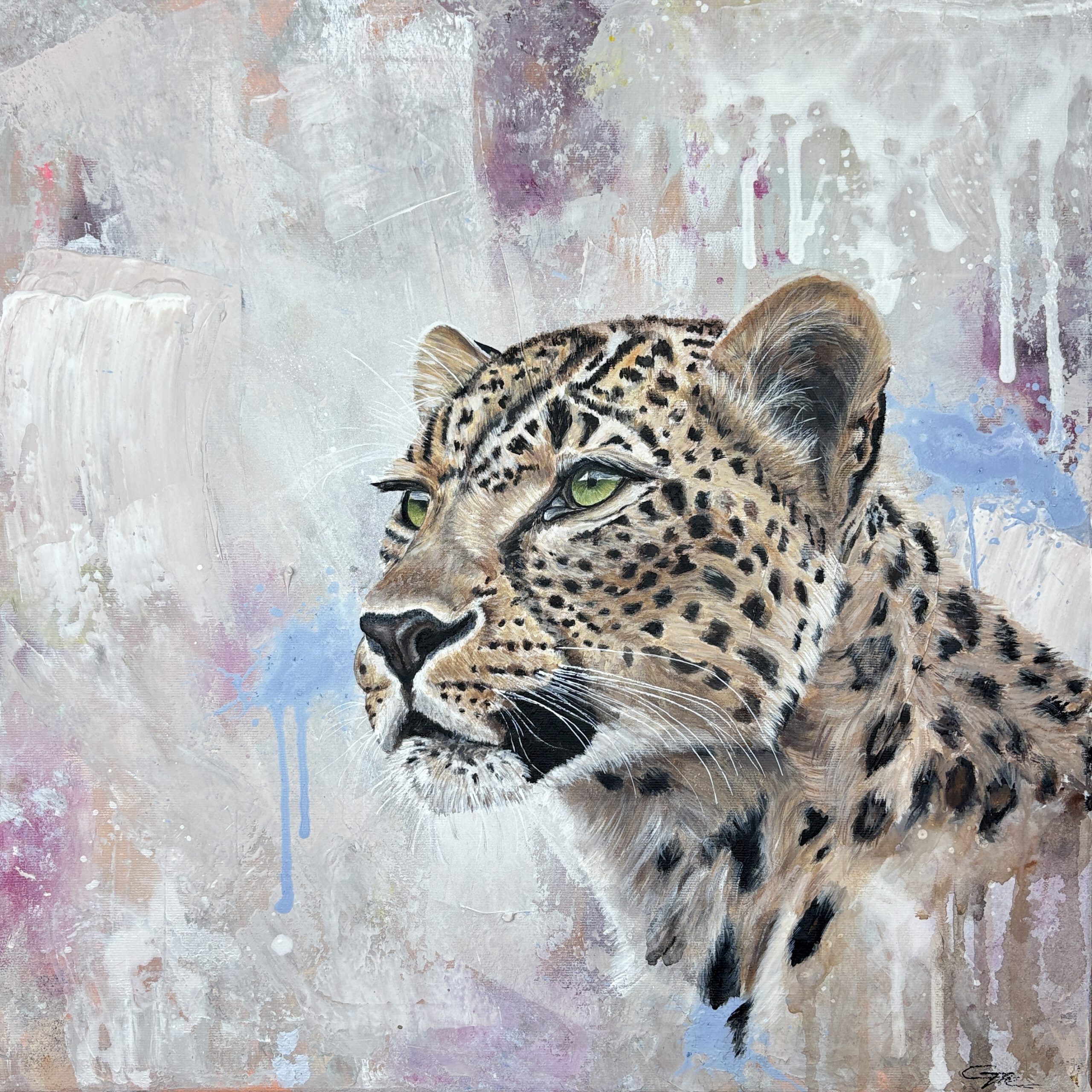 Dieses Kunstwerk zeigt einen Leoparden vor einem farblich abstrakten Hintergrund. Sein Blick ist wach und zielgerichtet. Er schaut nach vorne, ohne Angst.