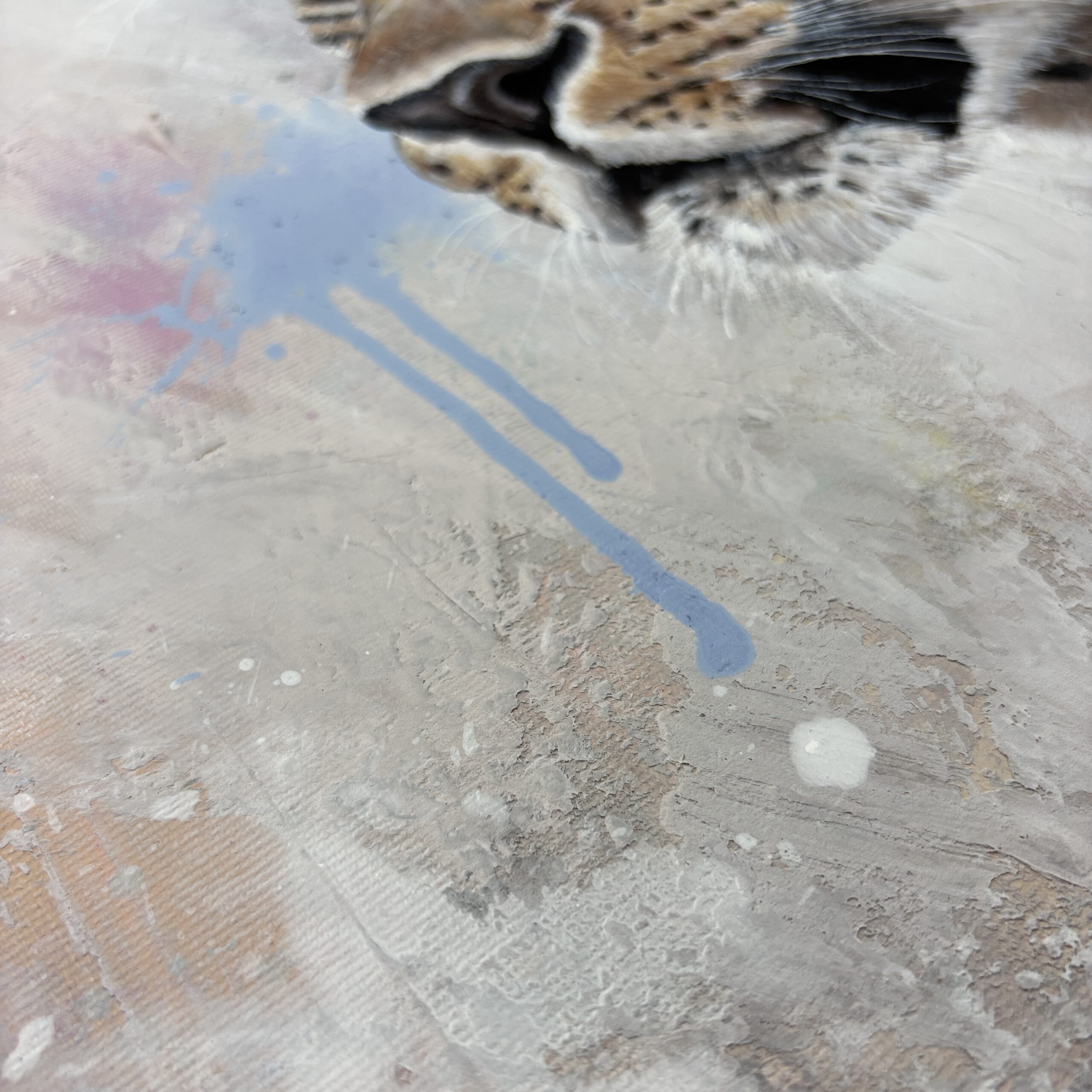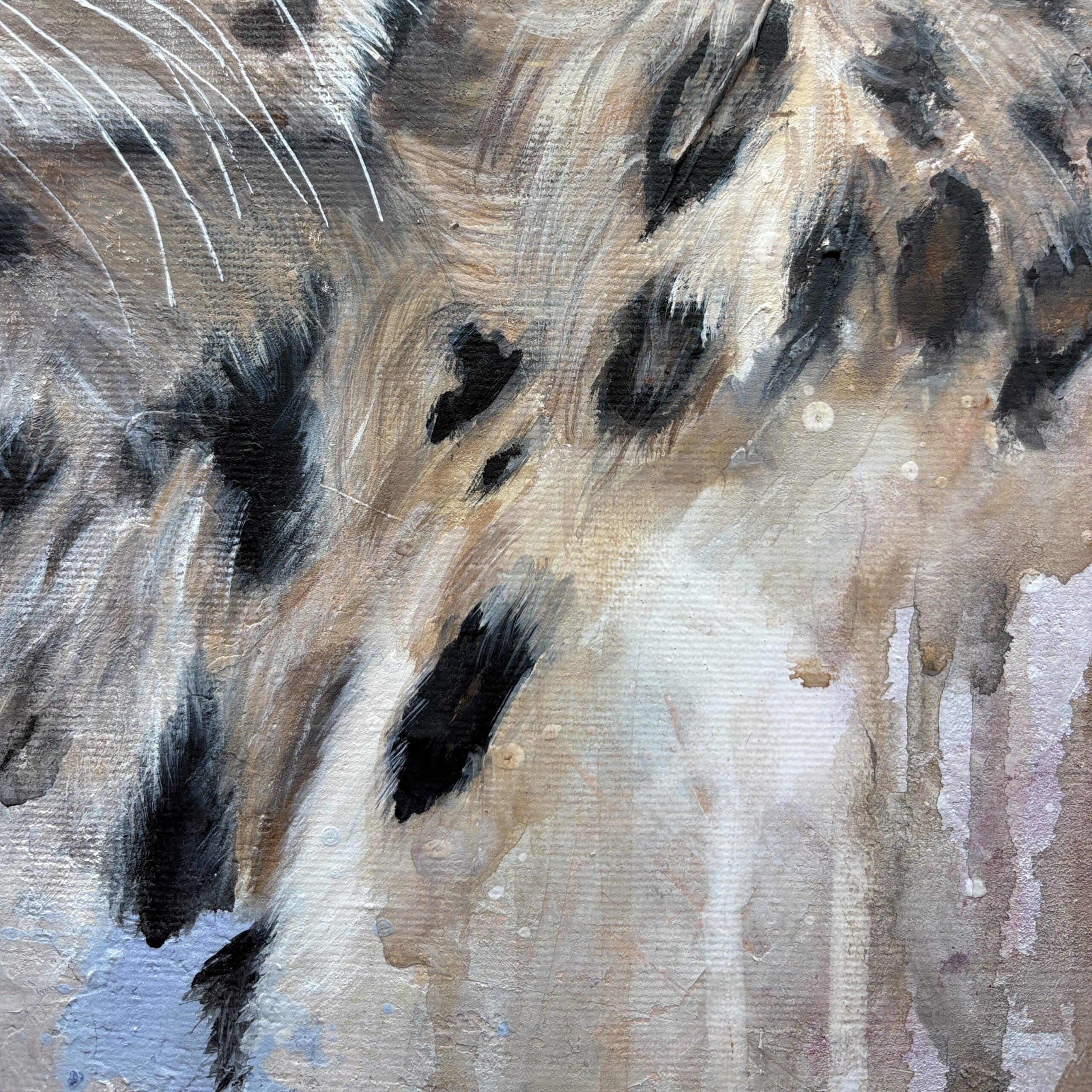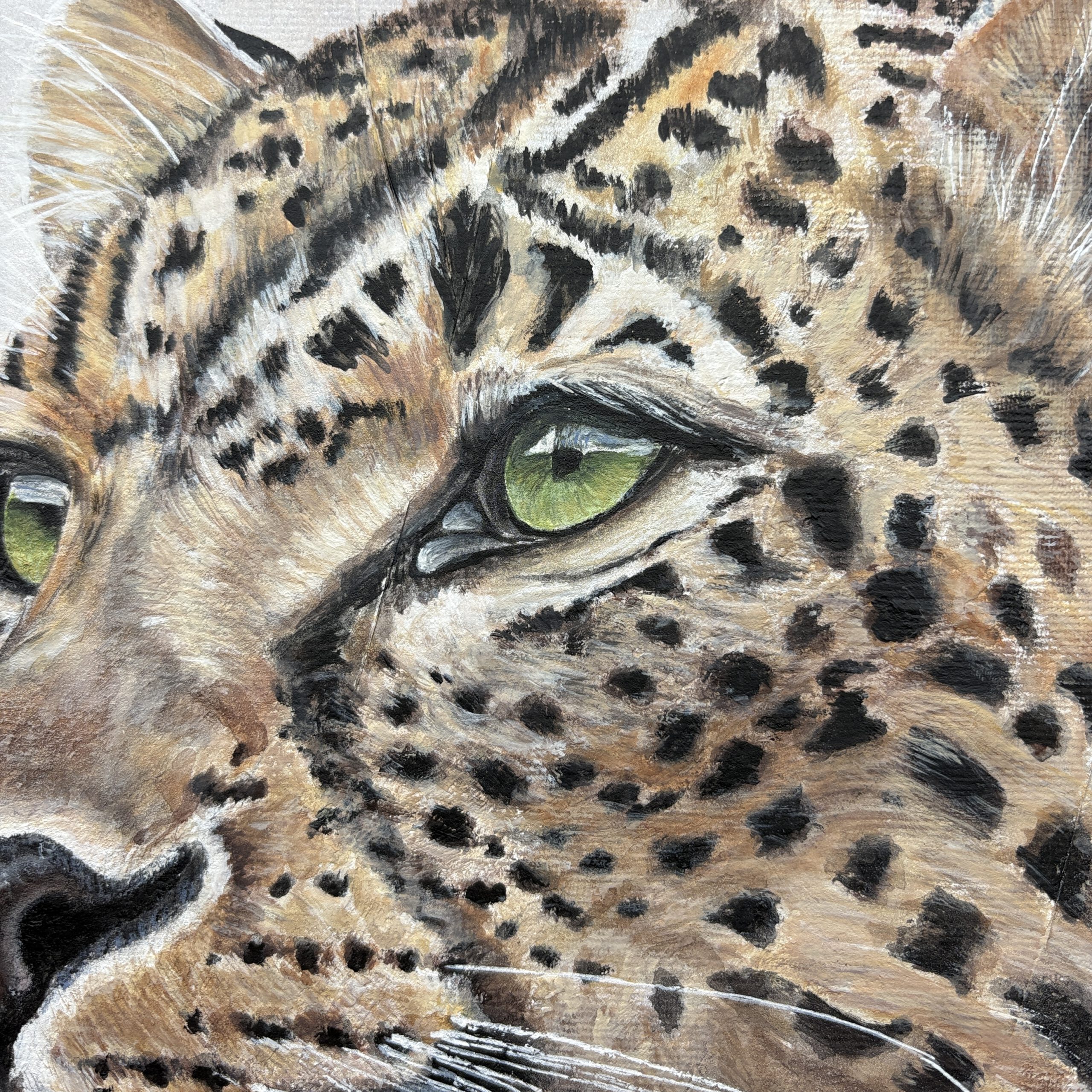 Dieses Kunstwerk zeigt einen Leoparden vor einem farblich abstrakten Hintergrund. Sein Blick ist wach und zielgerichtet. Er schaut nach vorne, ohne Angst.